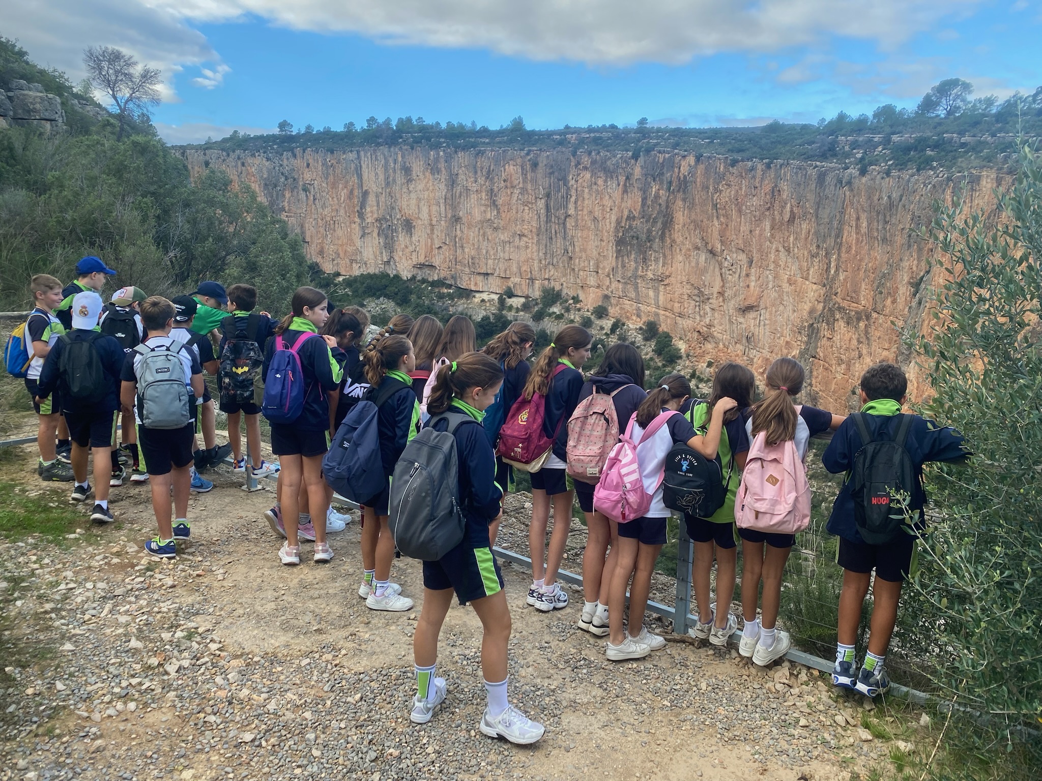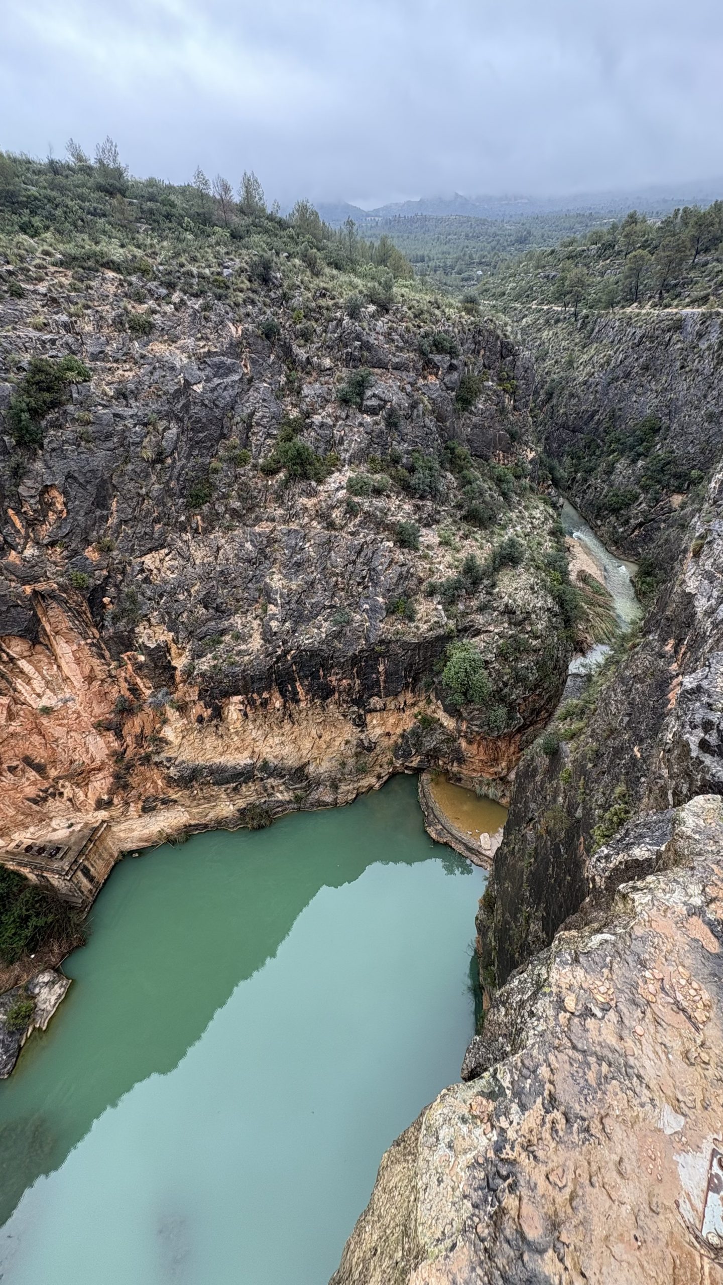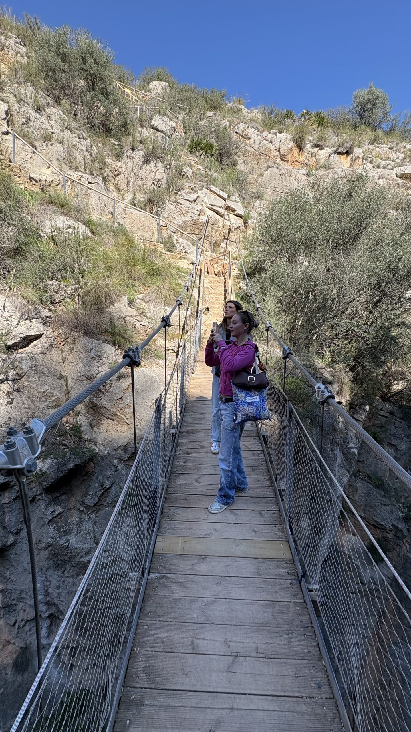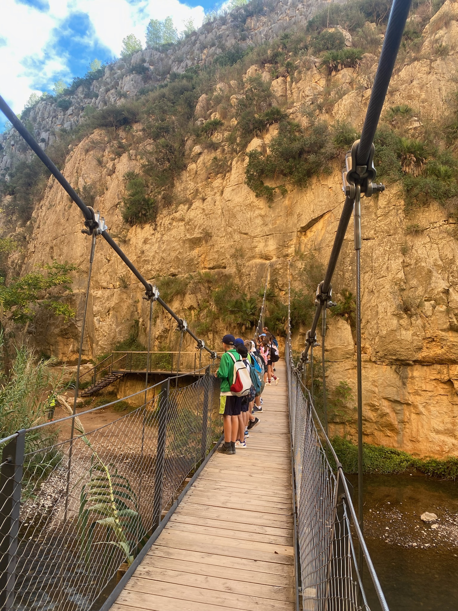 Giraremos siguiendo una de las hoces más marcadas y, llegado un punto, descenderemos por unas 100 escaleras, talladas en su mayoría en la piedra, hasta el primer puente colgante, situado a unos 18 metros de altura sobre el río, en una de las zonas más estrechas del cañón.